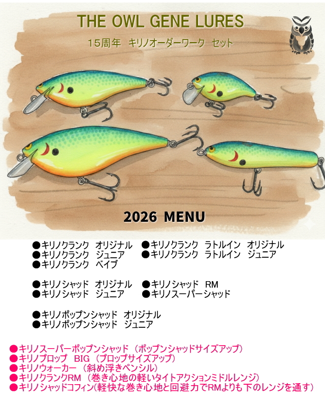 フレッド・ヤングが創りだしたアメリカンルアーの名作、「ビッグオー」にインスパイアされ、ジャパンハンドメイドウッドプラグが動きだした様に、その先人の伝統にインスパイアされて始動したのが、オウルジーンズの「キリノシリーズ」。
